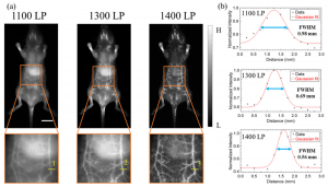 图2:NIR-II 全身小鼠成像:截止波长上移(>1000→>1300→>1400 nm)边界更清晰、对比更高。
